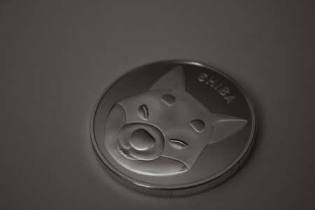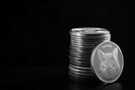 Shiba INU coin and stack of cryptocurrencies over dark background