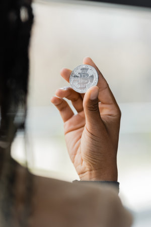 Cryptocurrency physical silver bitcoin coin on man hand outdoor.