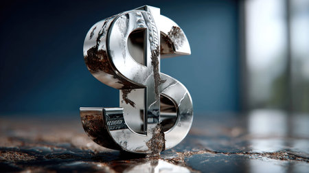 A striking metallic dollar sign stands on a rustic surface, reflecting light and creating a unique artistic representation of wealth and finance.