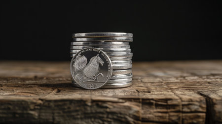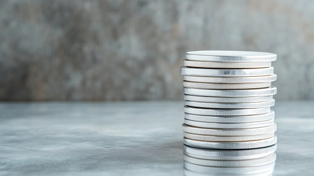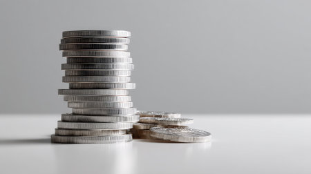 A visually striking arrangement of stacked metallic coins showcases intricate details against a minimalist background, ideal for finance-related themes.