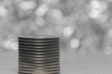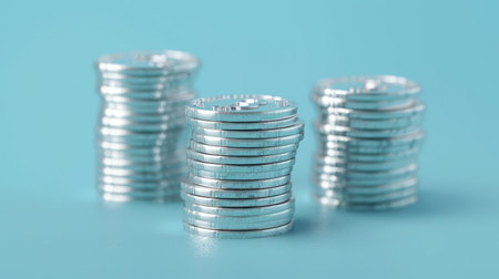 Bright stacks of coins shine brightly on a spotless surface, highlighting their metallic luster and perfect formation.