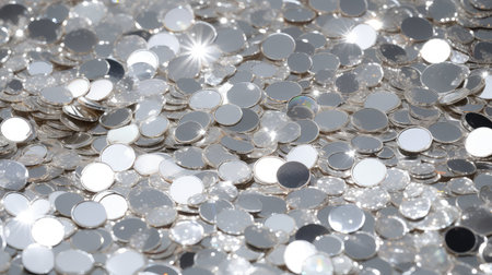 Shiny silver coins stacked in various heights create visually striking arrangement, reflecting light and casting colorful patterns on dark surface. image evokes sense of wealth and prosperity