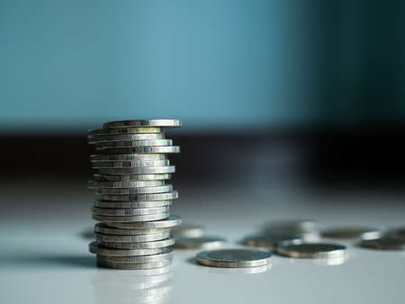 Stacks of coins in a growing progression. Background with copy space for text or inscriptions. Business economic development concept