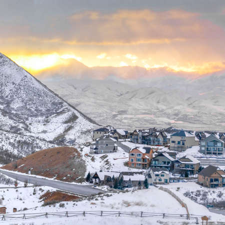 Clear Square Residential area built on a mountain blanketed with snow during winter season. The cloud-filled sky in the background has a golden glos at sunset.