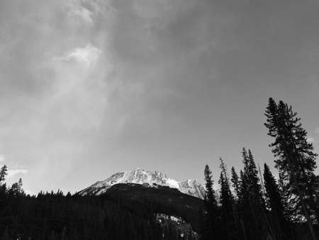 Mountain peaks with trees and snow covered tops. Horizontal shot.