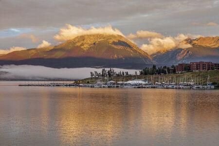 foggy sunrise over Lake Dillon and marina in Colorado with a mountain forest damaged by pine beetle