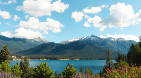 Panoramic view of mountains and lake in summer, Canadian Rockies