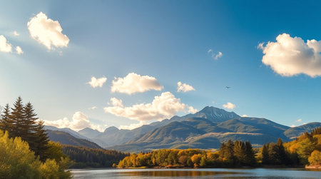 Panoramic view of autumn alpine forest and snow-capped mountains