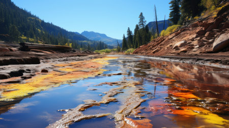 A striking image of a colorful oil spill on a calm stream, flanked by rich forest and distant mountains under a clear blue sky.