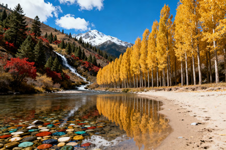 Golden aspen trees and pine forests reflecting in a tranquil lake against snow dusted mountains