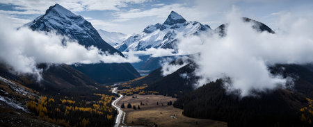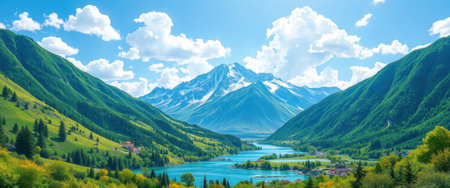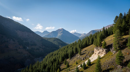 A peaceful road meanders through a stunning mountain valley, flanked by dense forests and majestic peaks, reflecting the beauty of nature on a bright sunny day.