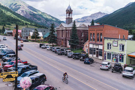 Silverton, Colorado - August 3, 2021: Overhead aerial view of downtown main street of the businesses, restaurants and shops