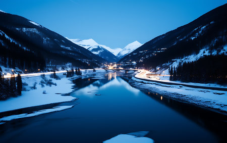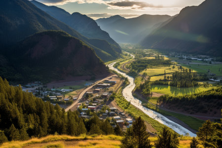 A picturesque town nestled in the valley surrounded by majestic mountains