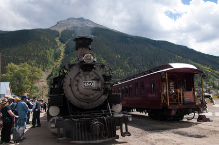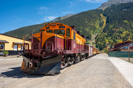 Durango and Silverton narrow gauge steam engine train stop in front of a beautiful mountain view during early fall foliage in Silverton town. Classic railroad transport in Colorado, USA.