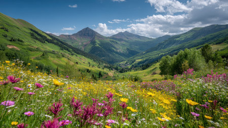 A picturesque view of a vibrant wildflower field set against a majestic mountain range, showcasing nature