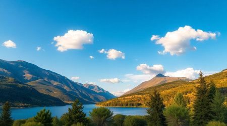 A breathtaking view of a tranquil mountain lake reflecting the vibrant blue sky and fluffy clouds, surrounded by lush greenery and majestic mountains.