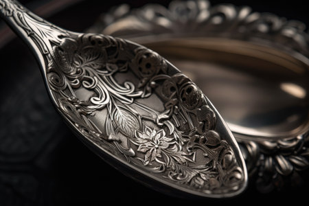 close-up of antique silver spoon with intricate engraving, created with generative ai