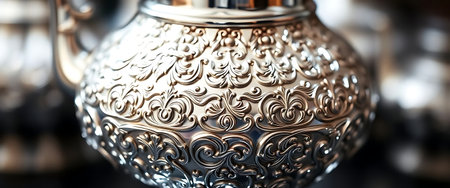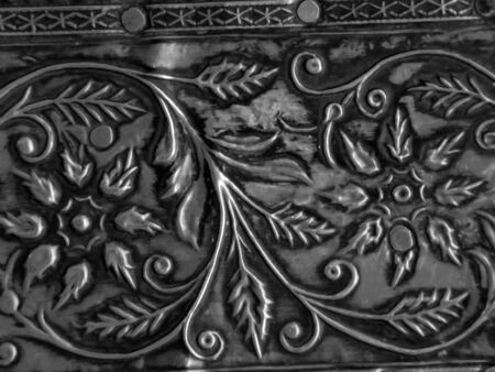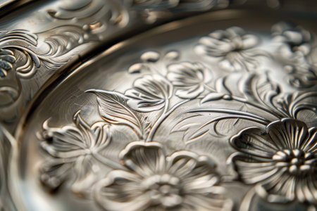 Captivating close-up of an intricate silver floral design on a historical artifact, showcasing exquisite craftsmanship and rich cultural heritage.