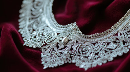 This stunning silver necklace features intricate designs and a pearl accent, beautifully displayed on rich burgundy fabric. Perfect for showcasing luxury and elegance.