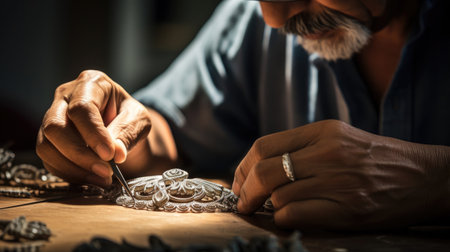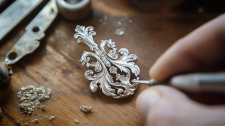 A skilled artisan delicately works on an exquisite silver jewelry piece, showcasing craftsmanship and intricate detailing against a wooden backdrop.