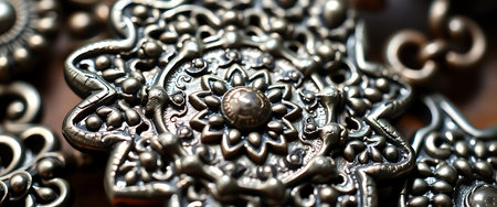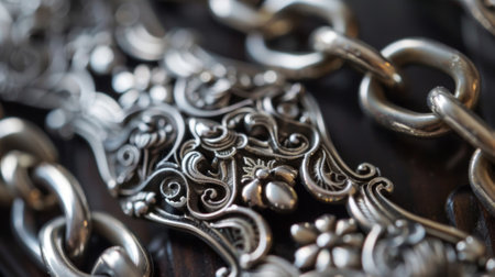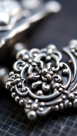 Stunning close-up of intricate silver jewelry pieces against a dark backdrop, highlighting exquisite detailing and craftsmanship that showcase timeless elegance and artistic design.