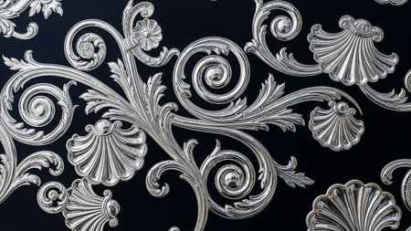 Intricate silver scrollwork and seashell motifs are arranged in a repeating pattern against a dark, textured background creating a luxurious and ornate design.