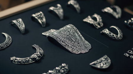 A stunning array of intricate silver jewelry artfully displayed, emphasizing detailed engravings and unique designs, perfect for showcasing craftsmanship and elegance in accessories.