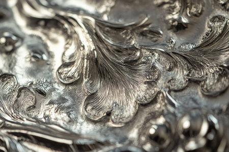 A macro photograph captures the exquisite, handcrafted details of an ornate piece of vintage silver.