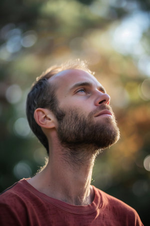A young man poses with a warm smile in soft natural light. The blurred background creates a serene and joyful atmosphere, perfect for capturing moments of happiness.