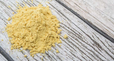 Ground mustard powder over wooden background