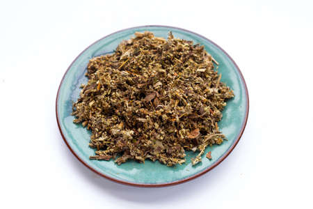 Dried absinthe wormwood in plate on white background.