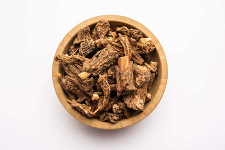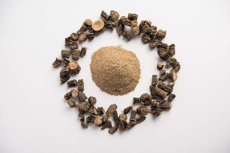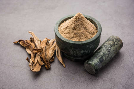 Ayurvedic essential herb to make almost all unique and basic beverages of India i.e. Indian sarsaparilla or Nannari with its powder on wooden surface.
