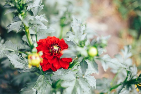 red dahlia in garden into green grass