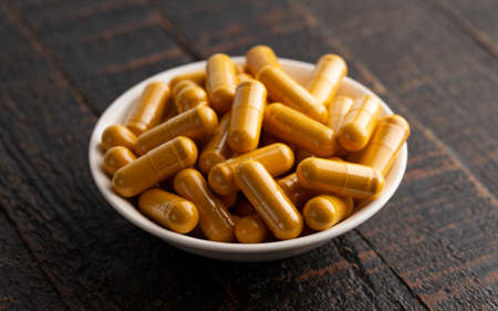 Ground Turmeric Capsules form on a Dark Wooden Table