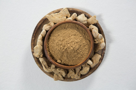 Directly above view of powder in bowl amidst dried gingers over white background