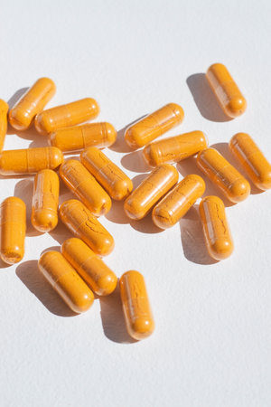 Herbal supplement organic curcumin. Turmeric plus black pepper extract gelatin capsule close up top view. Supports antioxidant health