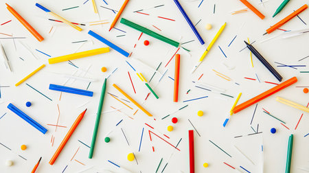 A vibrant assortment of colorful office supplies scattered across a white surface creates a playful and inspiring scene ideal for education and creativity.