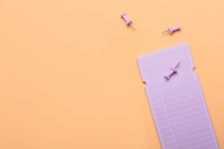 Top view of full thumb tacks in a transparent box and scattered on wooden background. It is a short nail or pin used to fasten items to a wall or board for display. Selective focus on foreground.