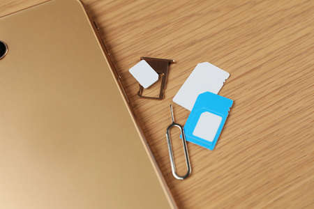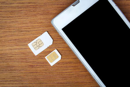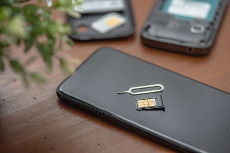 Close-up Of Nano Sim Card Ready To Insert In Smart Phone Over The Desk
