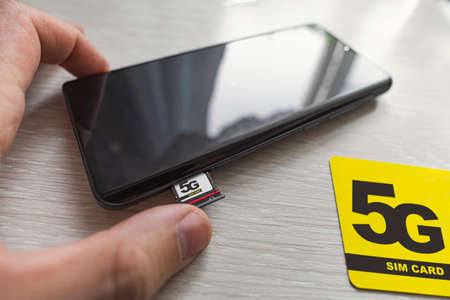 Replacing a 4G SIM card with a high speed 5g SIM card close up on the store's wooden table