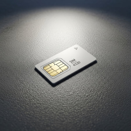 This image showcases a SIM card, featuring a microchip, resting on a textured, dark surface. The lighting emphasizes the card's details and the surface's texture. Suitable for illustrating telecommunications, connectivity, and technology concepts. Ideal for various commercial and editorial applications.