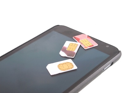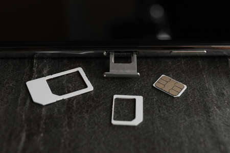 Blank white SIM card with different precut sizes and smartphone on black slate. 3D rendering and photo