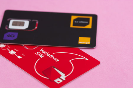 June 2019. Valencia, Spain. SIM cards to connect to Orange and Vodafone telecommunications companies using smartphones