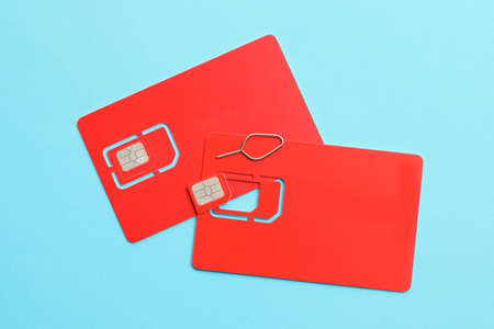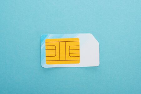 Subscriber identity module. New white SIM card on bright blue color background. Minimal flat lay top view