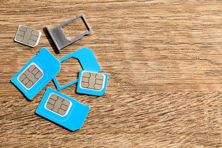 Different SIM cards and tray on wooden background, flat lay. Space for text