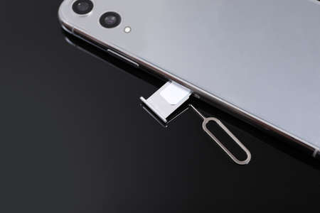The used Nano-SIM (4FF), the tray removed from the slot and the extractor for extracting the SIM card and the smartphone are on the table