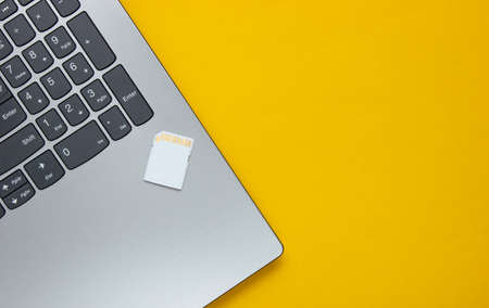 Laptop and SD memory card on yellow paper background. Modern gadgets. Top view