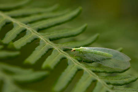 fern leaves on green background with a green mosquito on top. Space for copy. macrophotography. specimen of chrysopa occupata. Black speckled green lacewing