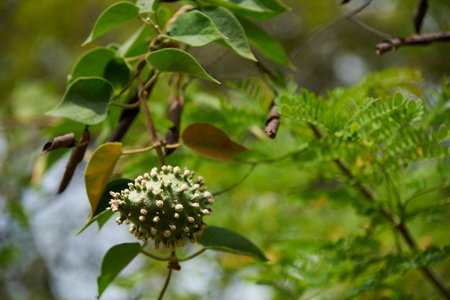 Close-up of young soursop fruit growing on a tree branch.