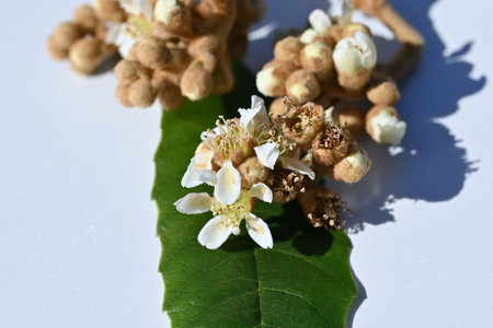 Japanese loquat flowers. Rosaceae evergreen fruit tree. Fragrant five-petaled white flowers bloom from late autumn to winter. Fruit can be harvested in early summer.